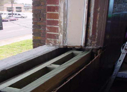 Photo shows putty knife sunk to the hilt in rotted sill. We also repair wood and metal sashes, framing and trim.